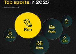 Strava’s Year In Sport analyseert data van meer dan 180 miljoen gebruikers en biljoenen activiteiten en kudos, geregistreerd tussen 1 september 2024 en 30 augustus 2025. Behoorlijk representatief dus. Uit het rapport blijkt dat hardlopen opnieuw de meest beoefende sport is onder Strava-gebruikers. Opvallend: niet fietsen, maar wandelen was het voorbije jaar de tweede populairste bezigheid.