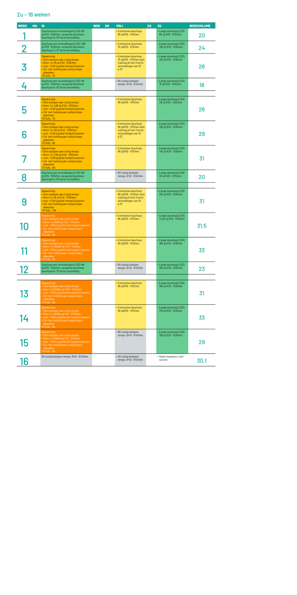Het schema bevat 16 weken en bevat wekelijks grofweg een intervaltraining, extensieve duurloop en lange duurloop. Het weekvolume wordt langzaam opgebouwd tot maximaal 33 kilometer.